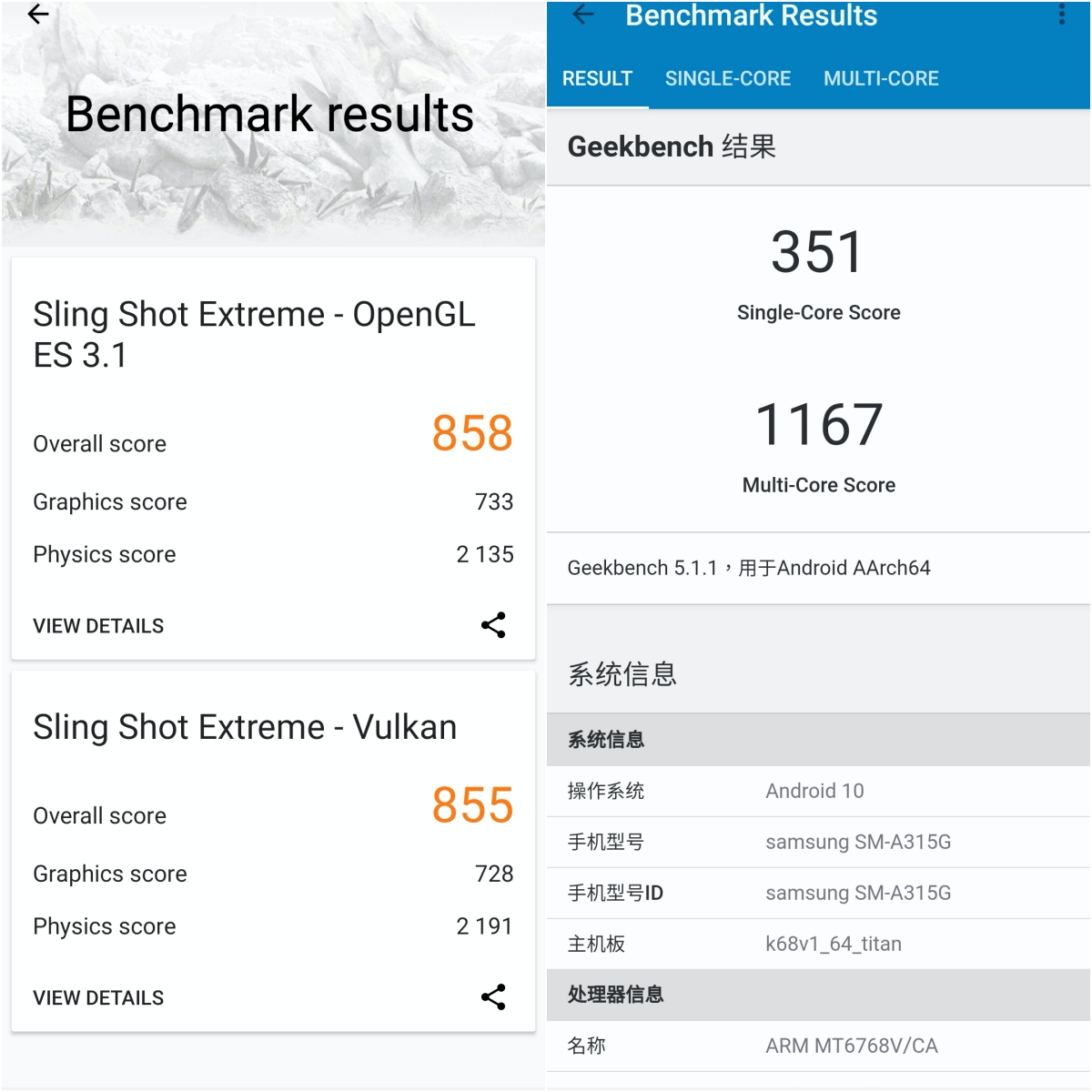 3DMark 透過 OpenGL ES 3.1 獲得 858、Vulkan 獲得:855。
