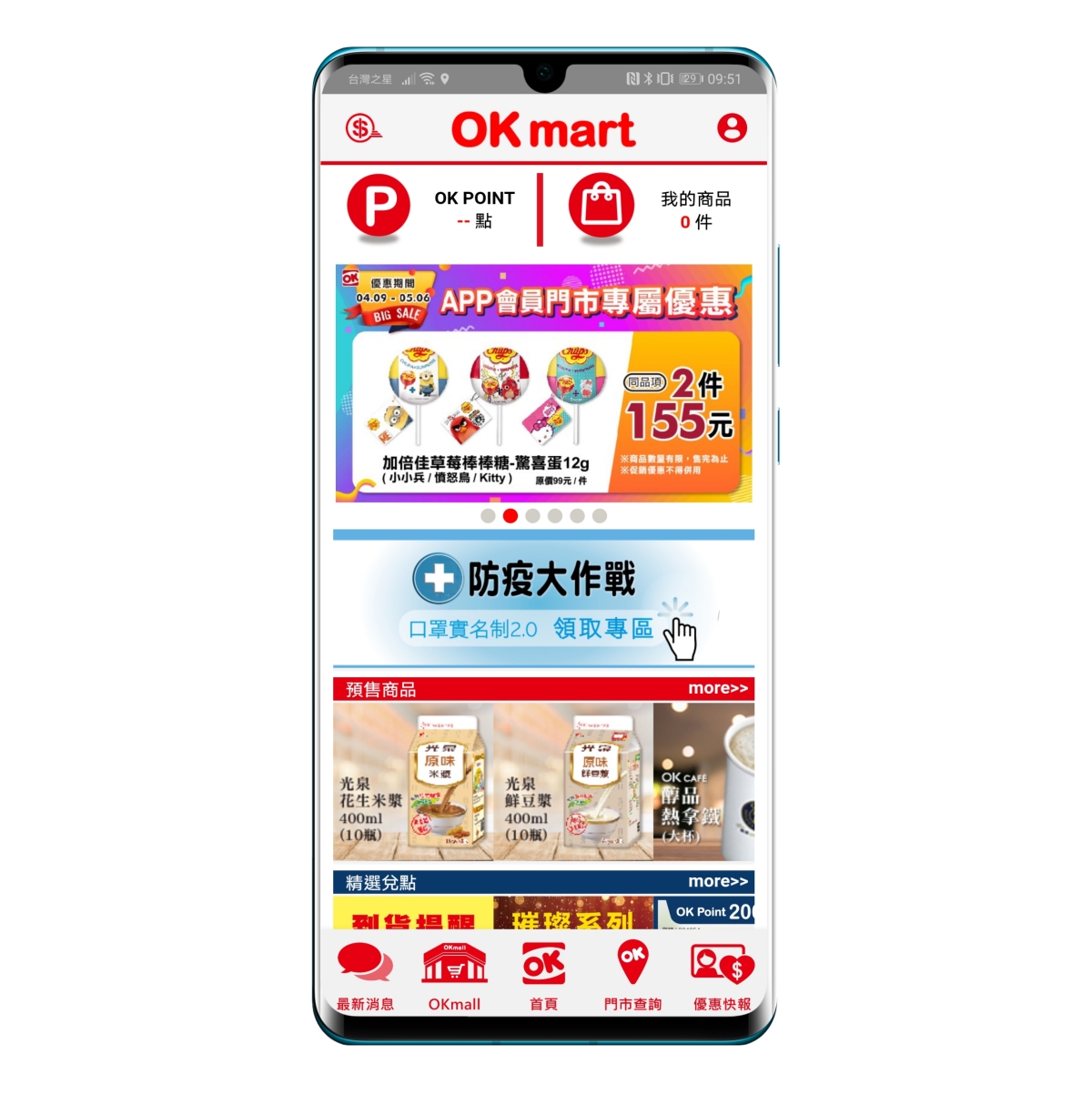 OK 便利商店的部份,是直接在首頁就有一個固定的 Banner,大大的寫著「防疫大作戰」,我覺得 OK 真的有誠意多了。