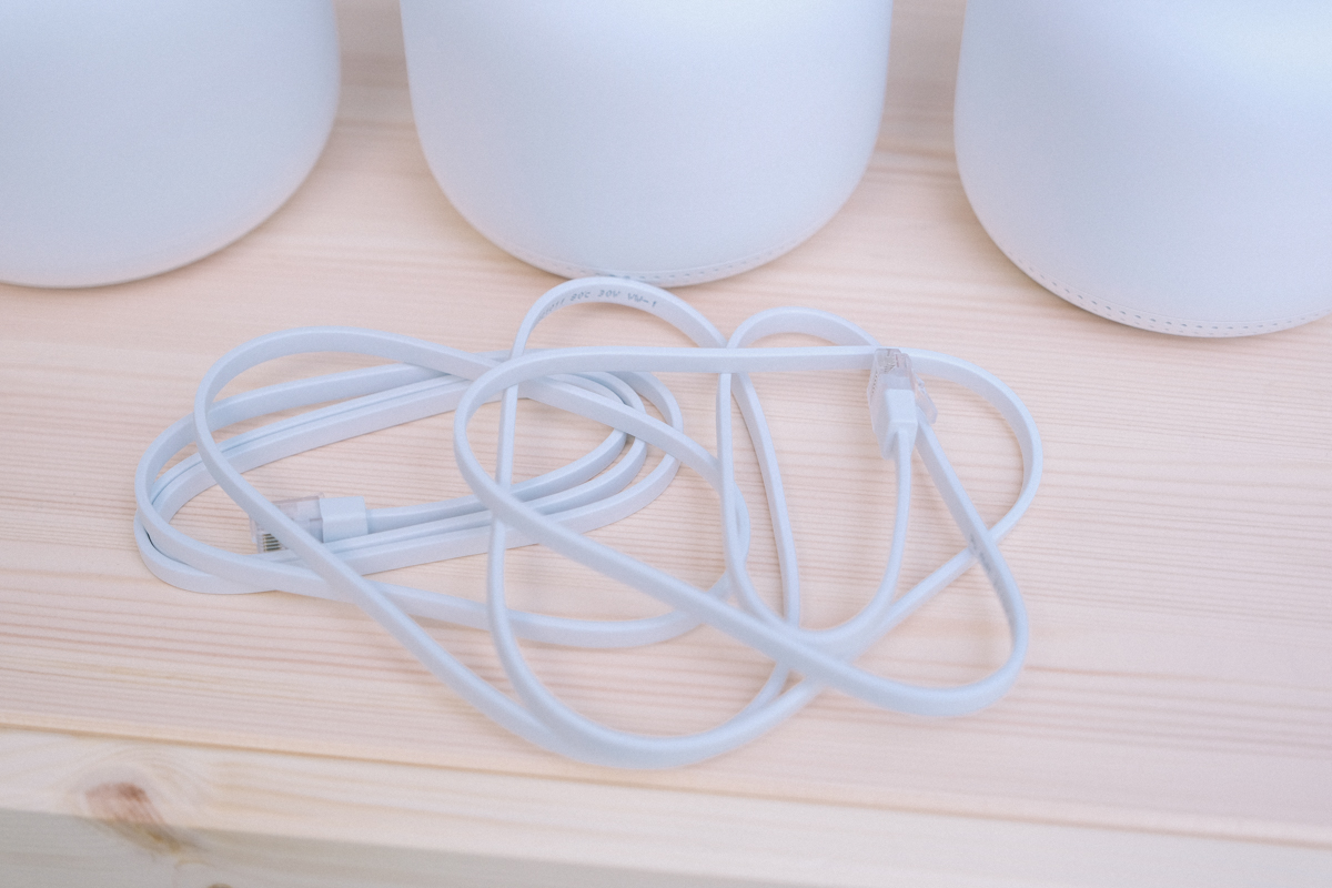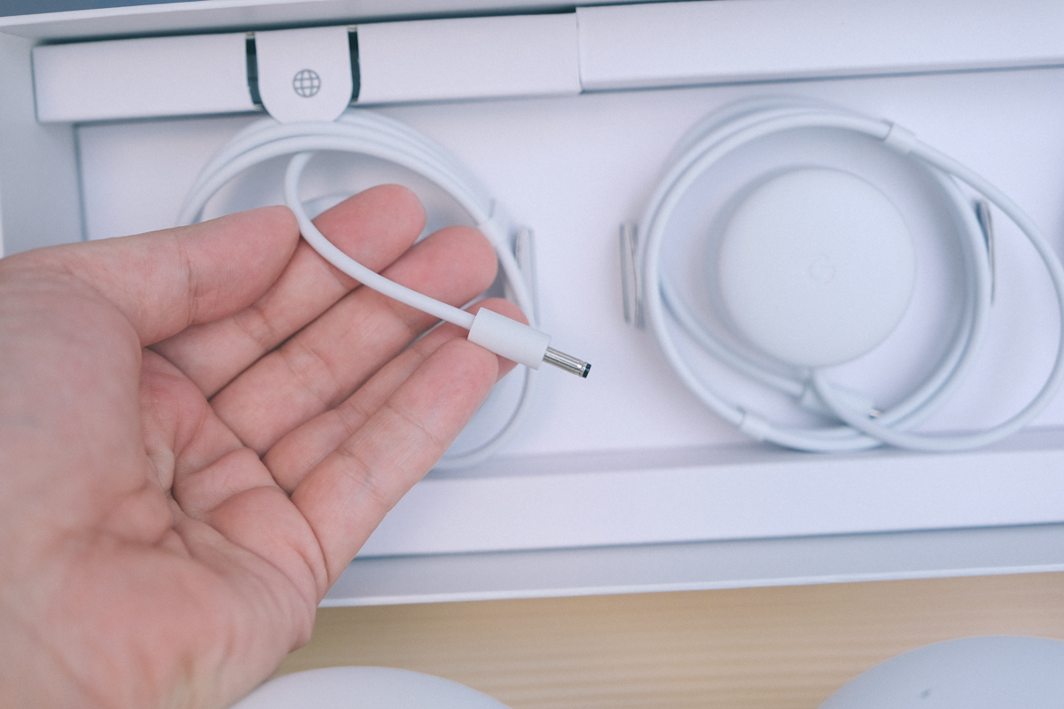 我購入的是 1 顆 Nest Wifi 加 2 顆 Points,左邊就是主要的無線路由器,右邊的就是 Point,主要差別就是,Point 是用來佈建 Mesh 網狀網路使用,而且內建有 Nest mini 的概念,佈置的位置還可以順便使用 Google 語音助理,非常方便,音質有些人估計是和 Nest mini 差不多,因為好像是用同一個零件,但是聽下來我覺得是比 Nest mini 的音質再好一些。
