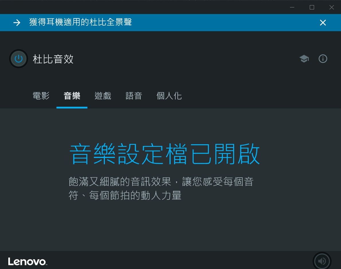使用筆電時相信大部份的人在外面都會使用耳機,ThinkBook 14 支援杜比音效,可以透過軟體來設定你的使用方式,達到更好的聲效感受。
