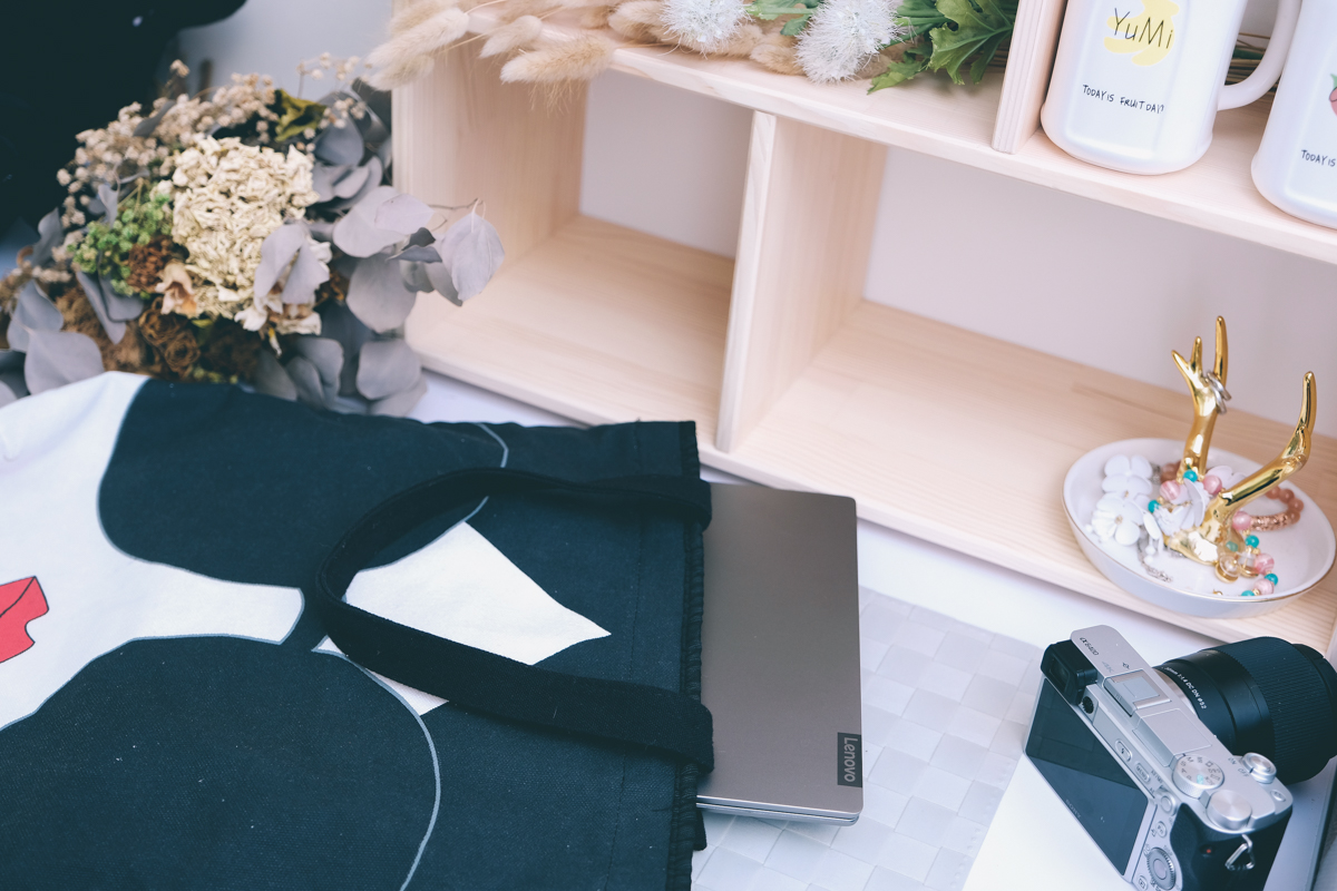 像顆老大現在很少帶包包出門,最常用的就是隨手可得的帆布袋,以她帶的大小,14 吋筆電只是小菜一碟,要再裝進他的補妝用品、相機、手機跟皮夾完全沒有問題。
