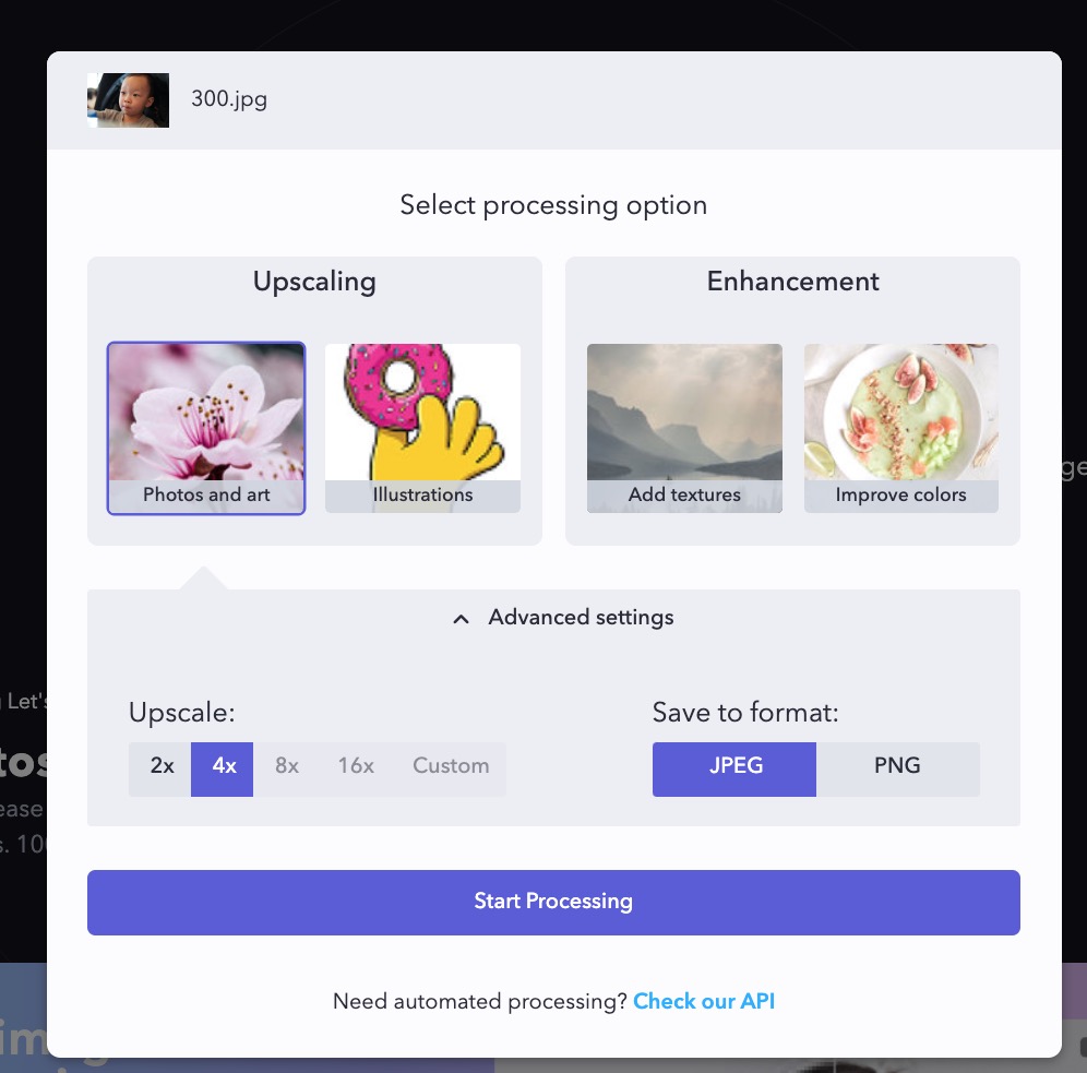 這邊可以選擇你的照片是哪一類,如果是照片就是第一個,其他你看圖就知道要選什麼了,而免費能選擇的倍數就是 2 或 4,檔案格式可以選擇 JPG 或 PNG(都可以)。