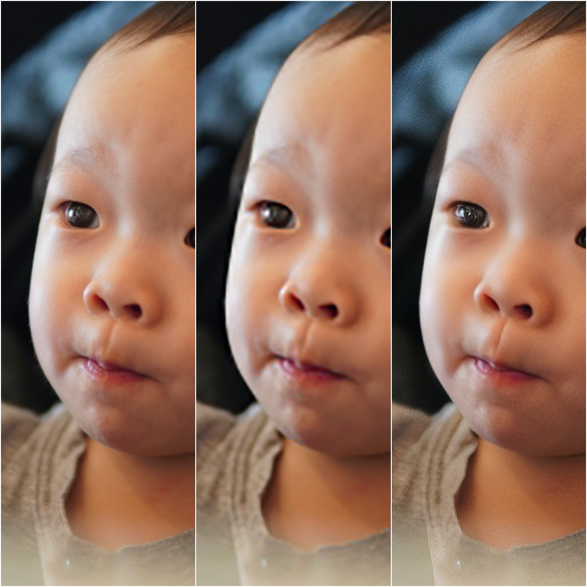 同樣左中右分別是原圖、用 PS 放大四倍的圖、用 Let's Enhance 放大四倍的圖,比起 2 倍放大的圖,眼睛有點失焦了,所以我覺得 2 倍還算可以接受,四倍有點太過了,不過還是比起 PS 直接放大的來的好一些,看來真的有需要時勉強還是可以用看看的。