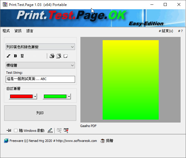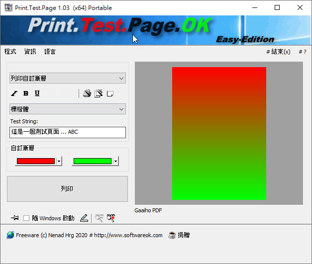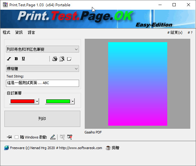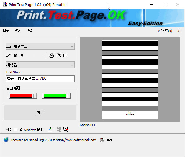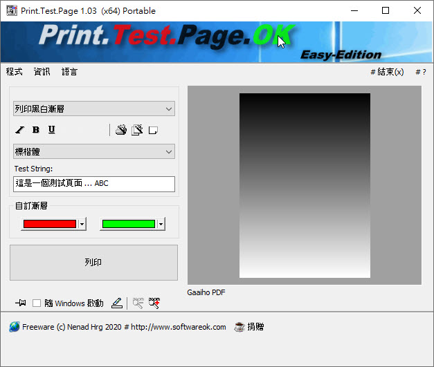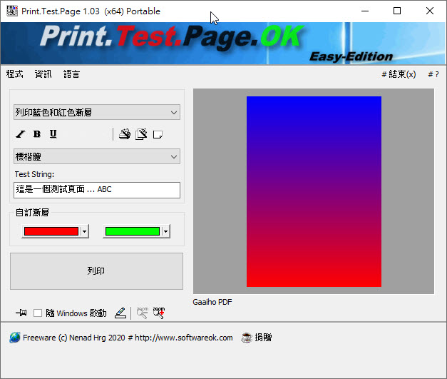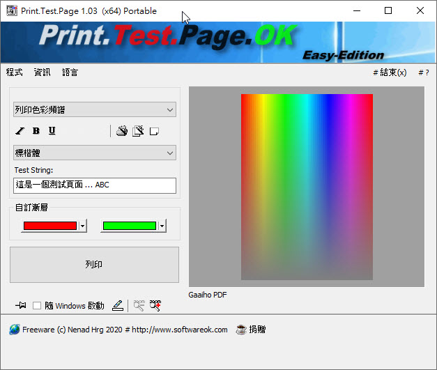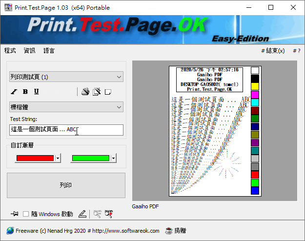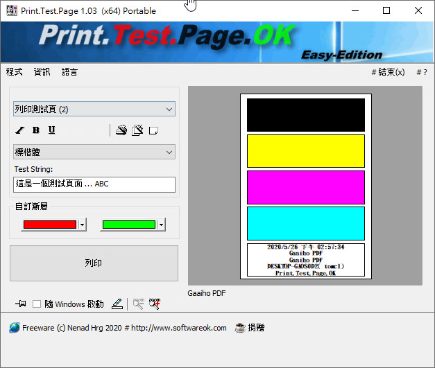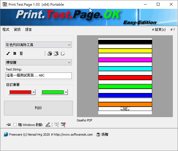 接下來就是直接選擇要列印的測試內容,然後按下列印就可以了,像最基本的是文字的部份,還有右側的各種色彩。