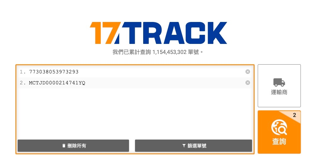 進入網站後,直接就可以在首頁輸入追蹤單號,一次可以輸入多行,就算是不同物流的單號也沒關係,你可以先試一下自動辨識有沒有成功,如果沒辦識到的再自己額外選運輸商就好。