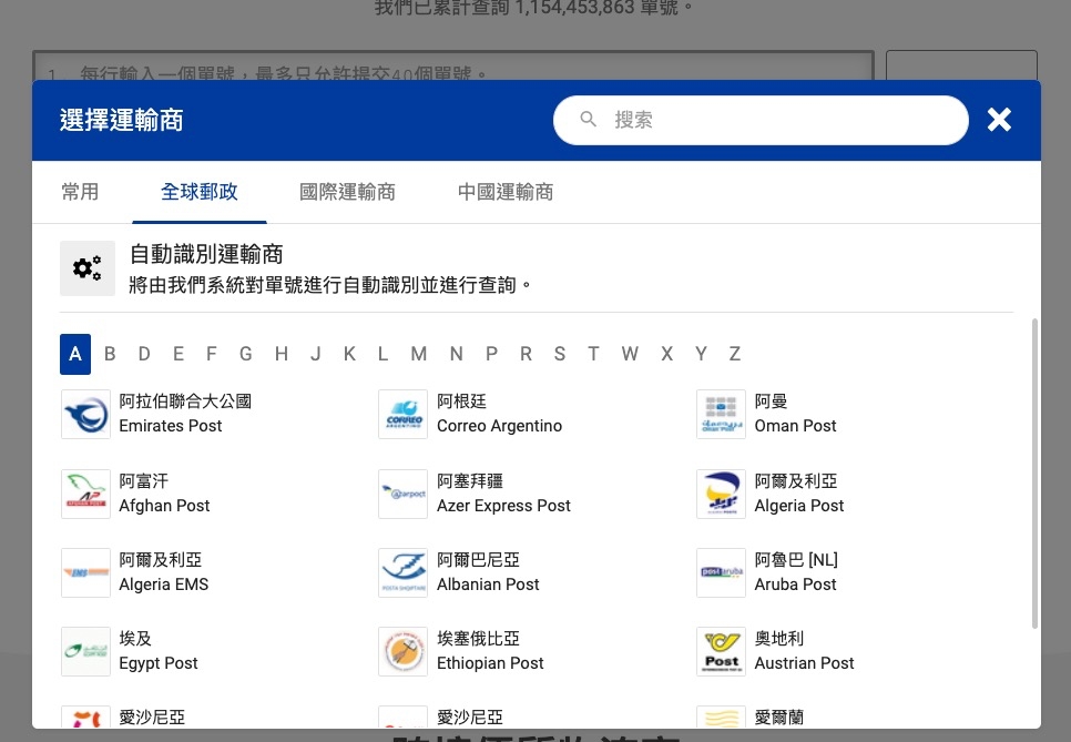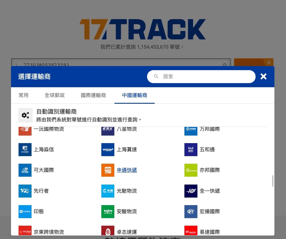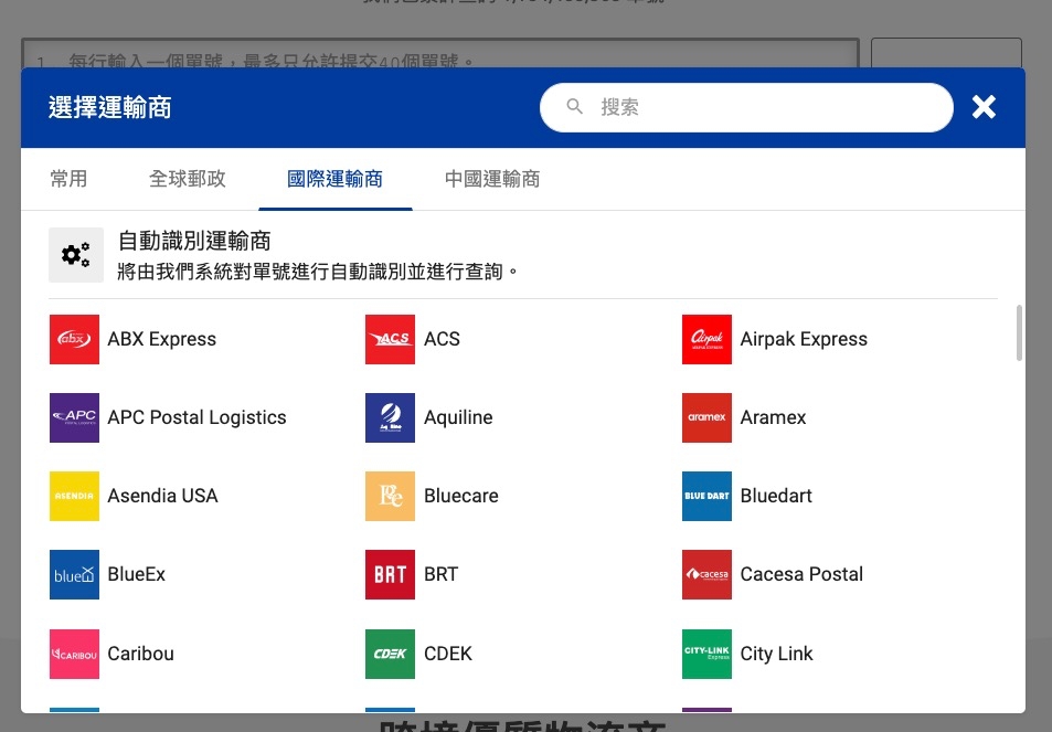 如果自動辨識失敗沒關係,就自己選擇物流商,這裡包括有全球的郵政、國際的物流以及中國本地的物流可以選擇。