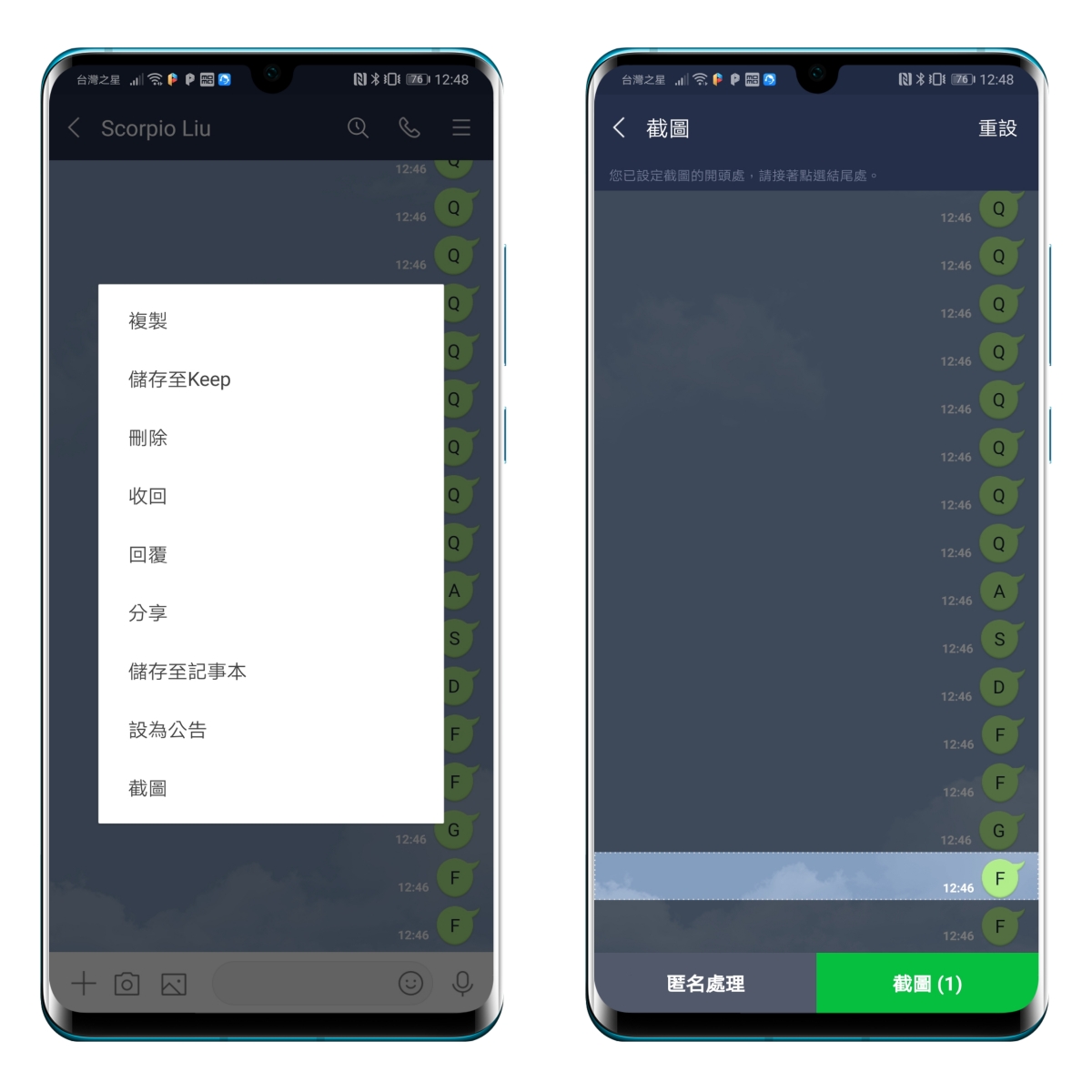 首頁 › 網路大小事 › Android 版本 LINE 終於也推出對話記錄長截圖功能,支援匿名截圖 Android 版本 LINE 終於也推出對話記錄長截圖功能,支援匿名截圖 發佈日期:2020/6/8 作者:阿湯 分類:網路大小事 在去年四月的時候,iPhone 上的 LINE 就已經推出「長截圖」的功能,是項非常方便的功能,當你對話超過二頁以上時,不用再一頁一頁的截圖,要截多長就有多長,而這項功能,原以為在 Android 版本上不久也就會推出,但結果等了這一年又二個月才推出了,無論如何,用 Android 的朋友,需要 LINE 對話記錄長截圖的話,現在就可以直接用啦,還支援匿名截圖。 Android 版本 LINE 長截圖功能: 首先在任一個你想要截圖的對話中,長按後會跳出選單,這時選擇「截圖」後,就會看到該對話被選取起來,這時你可以開始上下滑動,看你要截圖到哪一個範圍,就去按一下,就會幫你全選起來。 接下來就可以選擇要不要匿名截圖,如果選擇的話,對方的頭像都會被用其他圖片來取代,就看不出來是誰了。 截圖後就會像這樣,只剩下截圖記錄,其他都不會有,想要傳記錄給別人看的話,可以用這招,就可以兼顧到隱私。