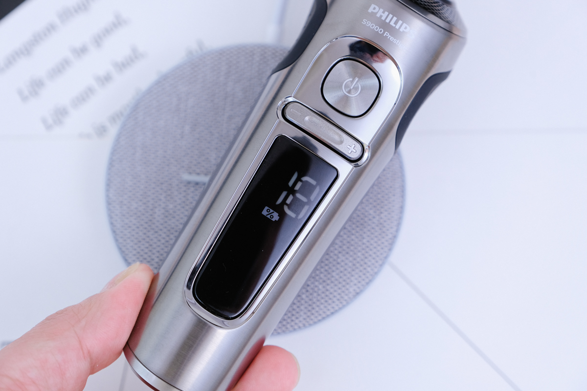 電鬍刀的操作就是要簡單,隨時拿起來都能立即使用,拿起只要按一下電源鍵就可以立即開刮,而下方的 + - 按鍵則是可以調整模式。