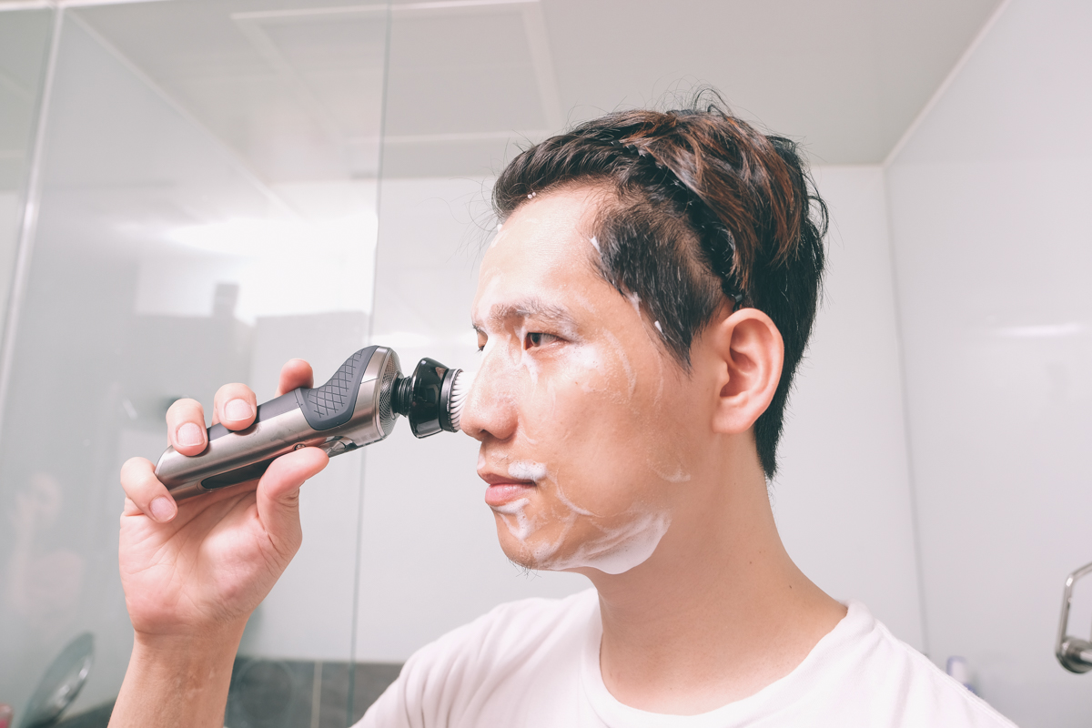 不囉嗦的立刻來試試,在拍照的時候就已經躍躍欲試了,在使用前我有特別留了快二週的鬍子,之前為了處理長短不一的狀況,先用剪刀去除較長的鬍子後再用微型電鬍刀處理,大概需要 3-5 分鐘,現在直接用飛利浦這款來刮只花了 1 分鐘就收工了。因為這上面還有搭載 AI 智能的「鬍鬚偵測傳感器」,每 15 秒會掃描臉上鬍渣一次,所以不論你的鬍子是濃密稀疏長短都能夠被精準的偵測出來,且自動調整轉速輕鬆的徹底的剃除乾淨。