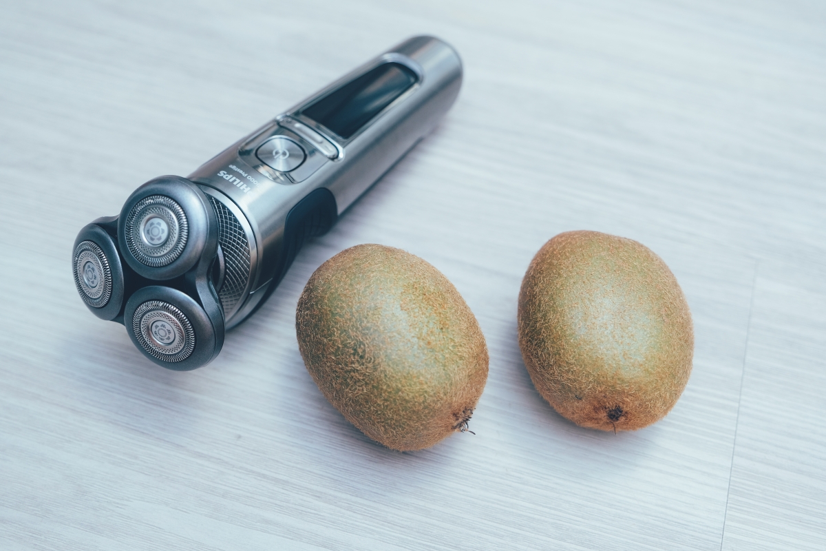 當然,阿湯的鬍鬚太少可能很難取信你可以刮到多乾淨,所以.... 我們就來拿奇異果開刀好了,奇異果表皮上的細毛如果不用放大鏡看的話,其實很難覺得有多茂密,但其實奇異果上的細毛算很濃密,如果飛利浦這把機皇連這個都能刮乾淨的話,我想這普天之下應該沒有什麼不能刮乾淨的臉了吧....