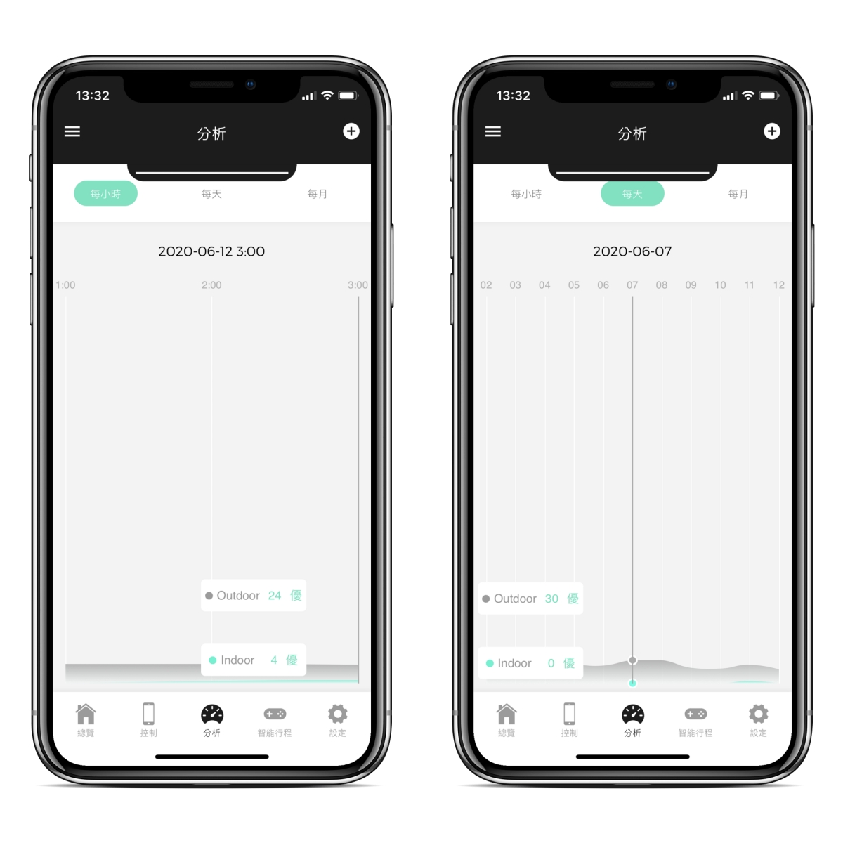 透過分析資料,也可以查看家中空氣品質的變化狀況,記錄包括每小時、每天及每月。