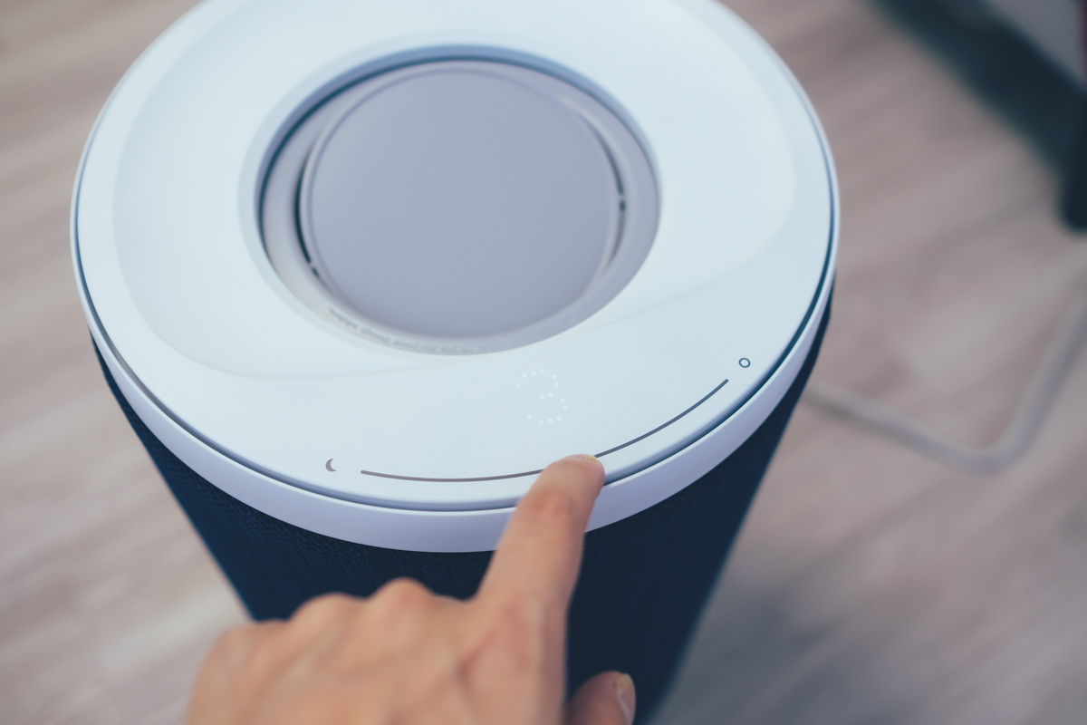 在這台 Aeris aair lite 空淨機上主要有三種模式可以使用,分別是睡眠模式、智慧模式以及手動模式,除了透過 APP 操作之外,面板上的月亮圖示就是切換為睡眠模式,最右邊的 O 就是切換為智慧模式,而中間的灰色線條,只要用你的手指頭,在上面滑動,就可以切換 1~5 段的風量出風。