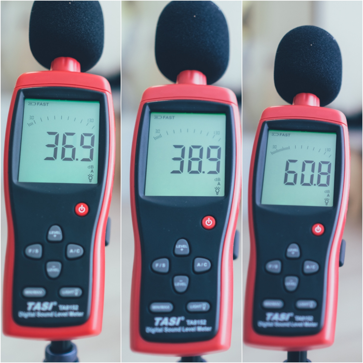 運轉音量的部份,阿湯也用分貝機做了實測,下圖由左至右的音量分別代表如下: