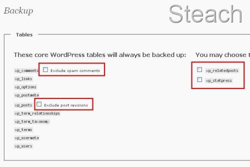 Exclude spam comments:排除垃圾留言 Exclude post revisions:排除修改後的文章 右邊紅框中勾選代表是否包含備份以下資料表