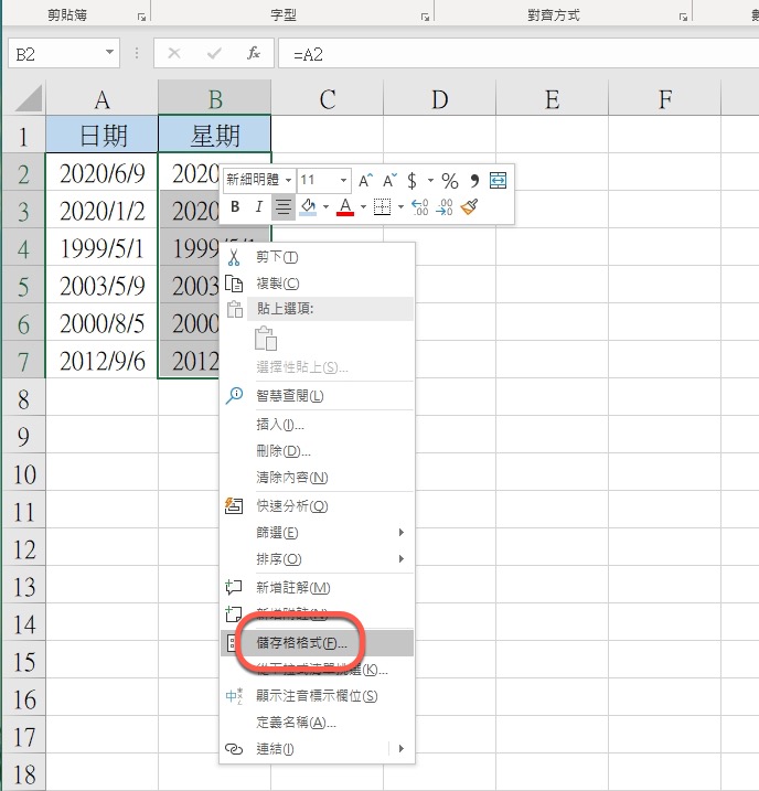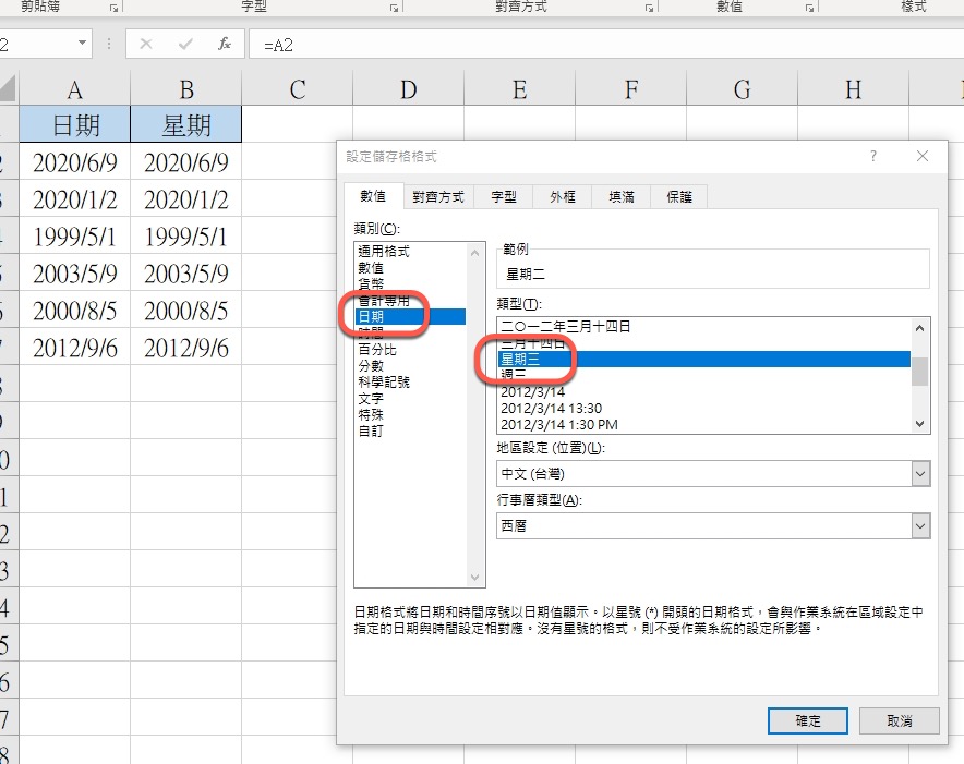 Excel 教學 - 將日期顯示星期幾的二種方法