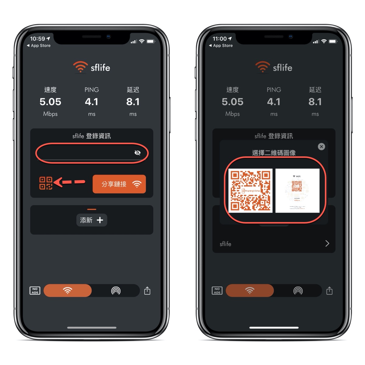 不論是 Android 或 iOS 都有,下載後使用真的超簡單,首先他會先抓取目前你連接的 Wi-Fi SSID,你只要輸入密碼後,點擊左邊的小 QR 圖示,就會提供你二種 QR Code 的呈現方式,左邊是單純的 QR Code,右邊則是還帶一點資訊,看你想用哪一個都可以。