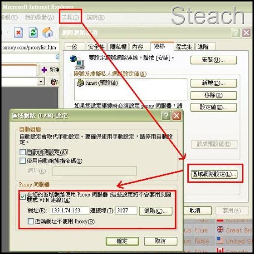 工具→區域網路設定→連線→設定值然後輸入代理伺服的 IP 和連接埠按下確定即設定完成