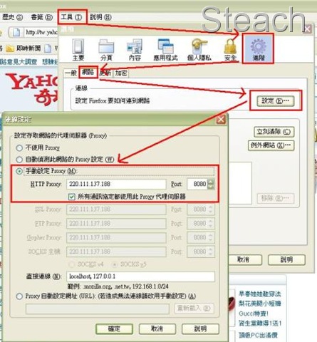 工具→進階→網路→設定然後輸入代理伺服的 IP 和連接埠按下確定即設定完成