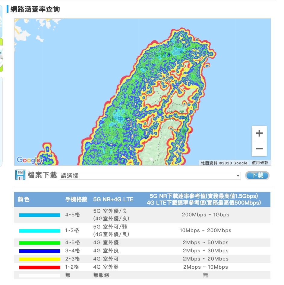 地圖放大後可以細看每一區域,像中華的是藍色,深藍色是訊號好的,其實淺藍色不用看,按照之前 4G 的經驗,沒有深藍色的話大概也只會跑 4G 為主了。