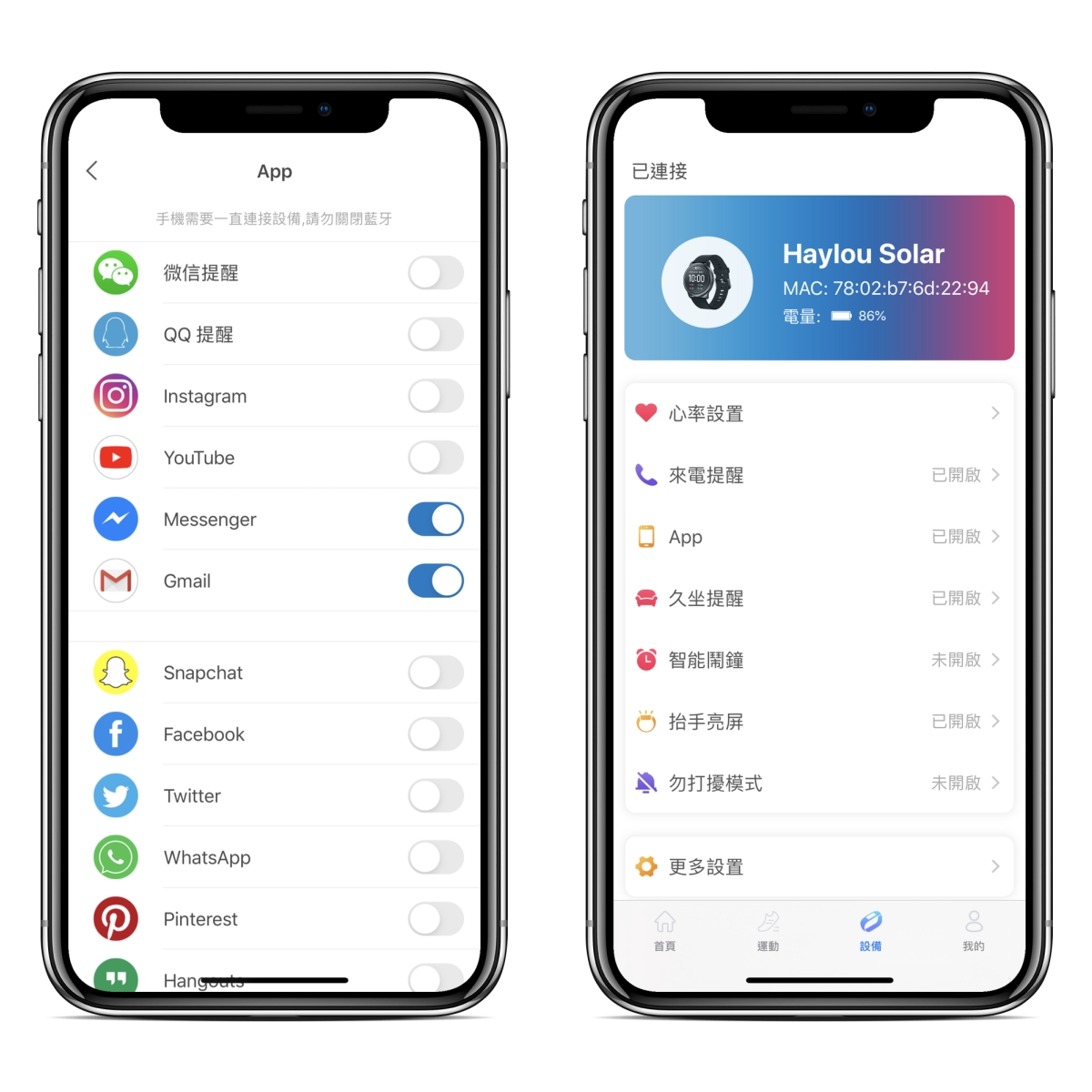 手機訊息通知的部份,你也可以透過 APP 的設定來選擇要接收哪些 APP 的通知,像我就只接收幾個重要的,像是 Gmail、Messenger、LINE 等,也開啟了來電提醒,這麼一來就不用時時刻刻拿起手機查看訊息,相當來說,智慧手錶其實也可以某種程度的減少你去看手機的時間。