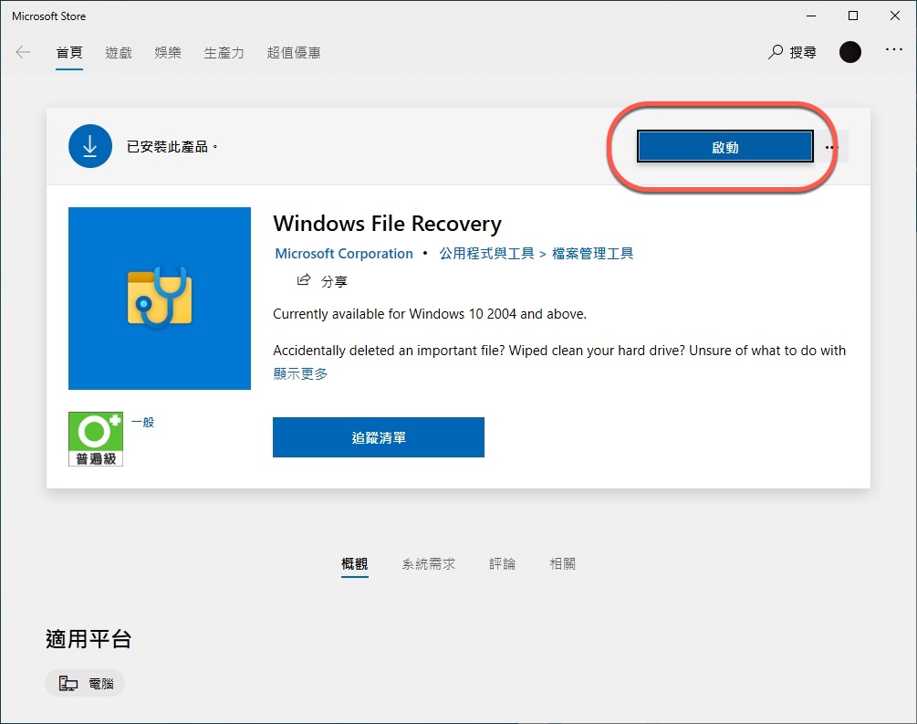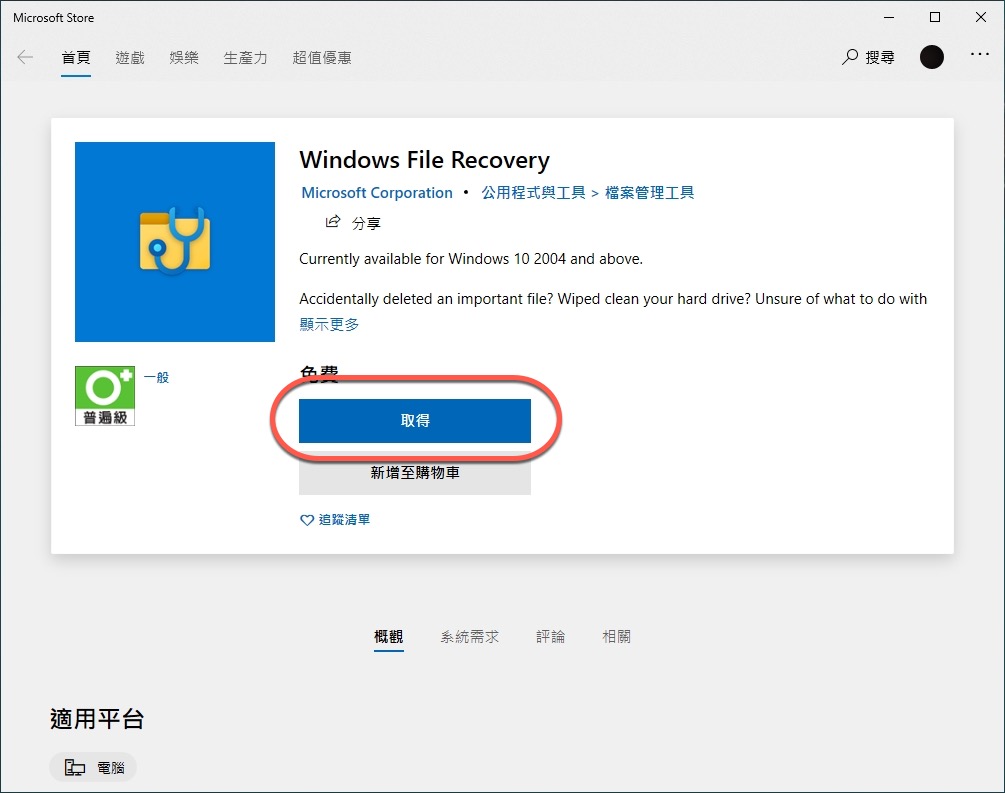 點擊後進入網頁,按下取得就會進入微軟商店可以進行安裝,或者直接在 Windows 選單裡的 Store 搜尋軟體名稱也可以。