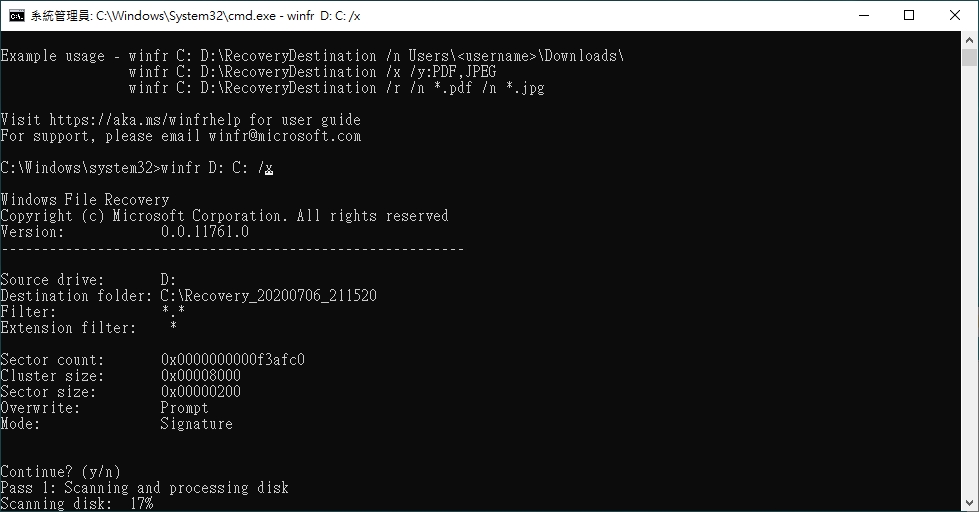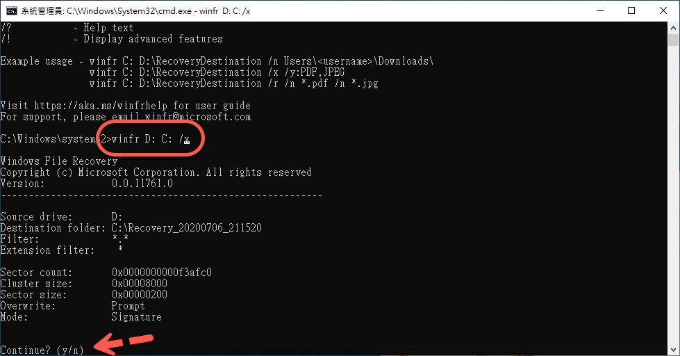 輸入指令後再按下 Y 就會開始復原。