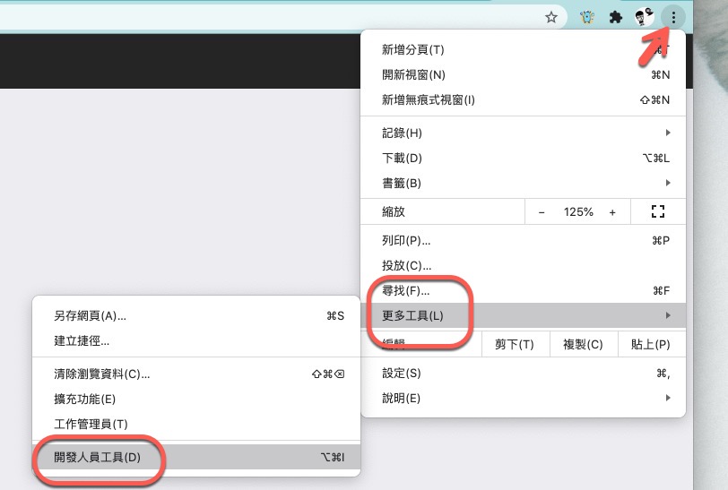 如果你不想改網址,第二個方法就是將瀏覽網頁強制改成手機模式,以 Chrome 瀏覽器為例,先在右上角選單 > 更多工具 > 開發人員工具。