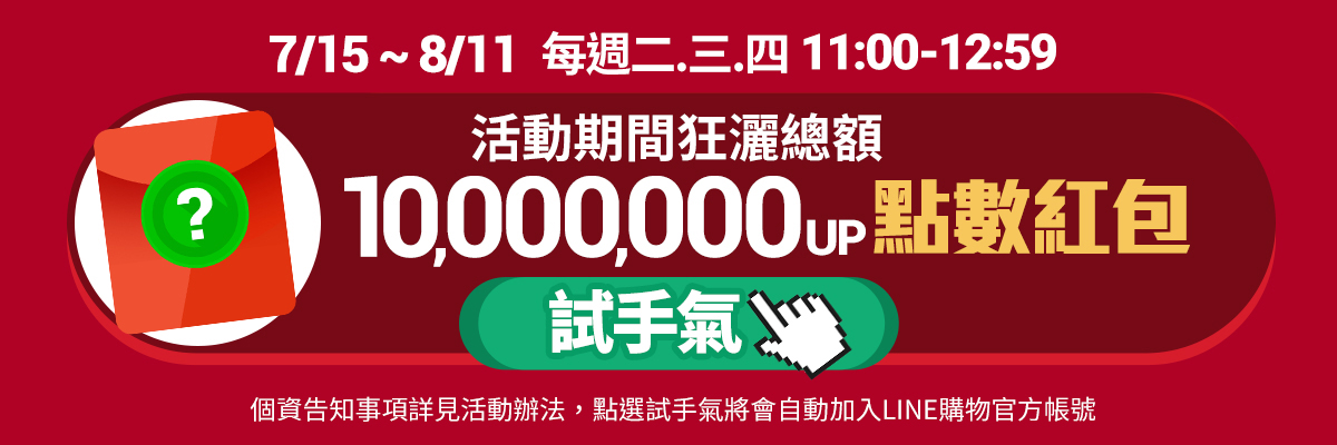 灑狗糧活動(誤),是灑點數紅包活動,在 7/15 - 8/11 期間,每週二、三、四的上午 11:00~12:59,只要在 LINE購物裡進入活動主會場後,看到以下 Banner 點擊「試手氣」就有機會獲得點數紅包(有三種面額:50、888、1688),通通有獎,除了三種不同面額的紅包外,還會有酷券和驚喜優惠賣場等其他獎項。