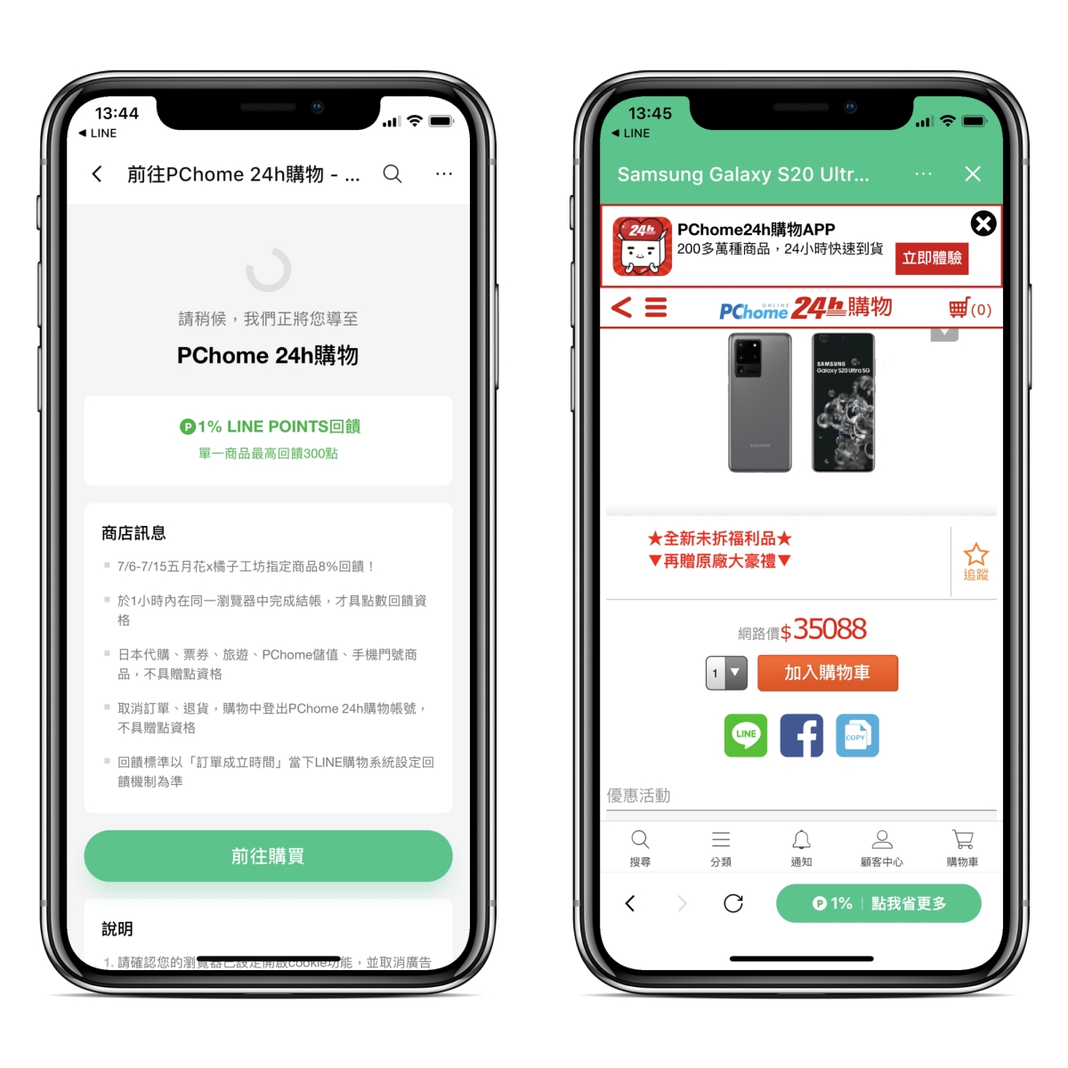 LINE購物不是線上購物平台,所有你在 LINE購物 APP 裡搜尋的商品,上面都有標記是在哪一個平台,當你點擊後就會直接幫你導向該線上購物平台,剩下都跟你原本購買流程一樣,導去 PChome 就去那結帳。