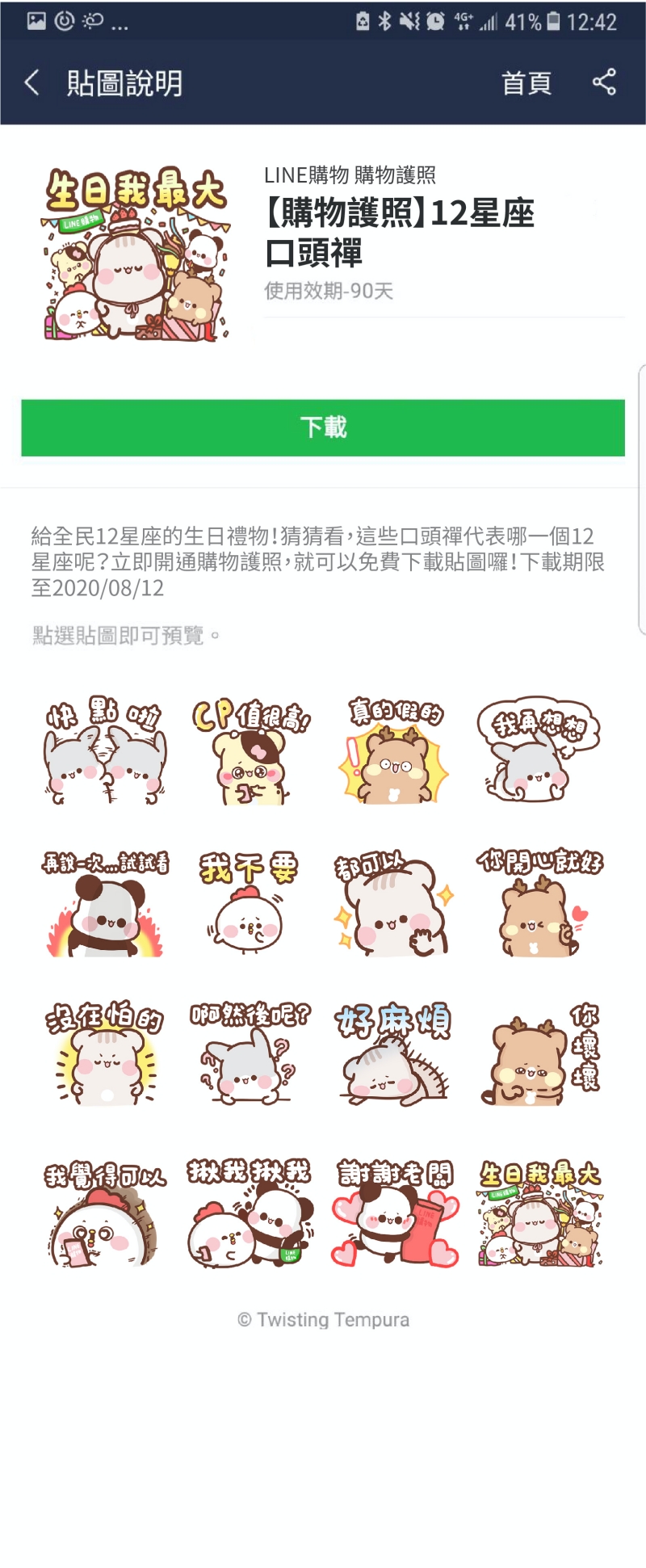 這部份同樣會不定期的推出不同的活動,最新上線的活動就是免費下載松尼奇尼 12 星座口頭禪貼圖(使用期限 90 天),參加生日特權活動就可以馬上完成領取。