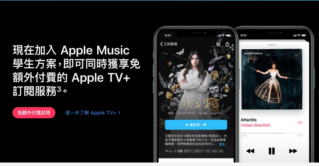 網站:https://www.apple.com/tw/apple-music/進入網站後拉到最底下,就會看到「學生方案」的「免額外付費試用」。