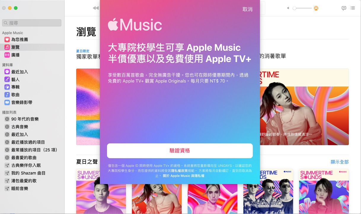 如果是用電腦的話,點擊之後會跳出音樂 APP(macOS),或者你也可以先用手機,安裝好 Apple Music 即可,就會跳出要驗證學生身份的畫面,接下來就跟著步驟就可以了,阿湯沒有學校 Email 就無法為大家往下繼續,想要的快去註冊吧。