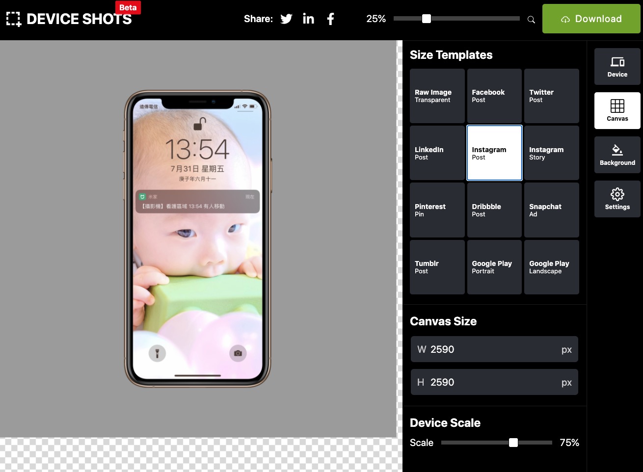 如果你打算分享使用在社群上,右邊 Canvas 就可以幫你直接設定好輸出的比例。