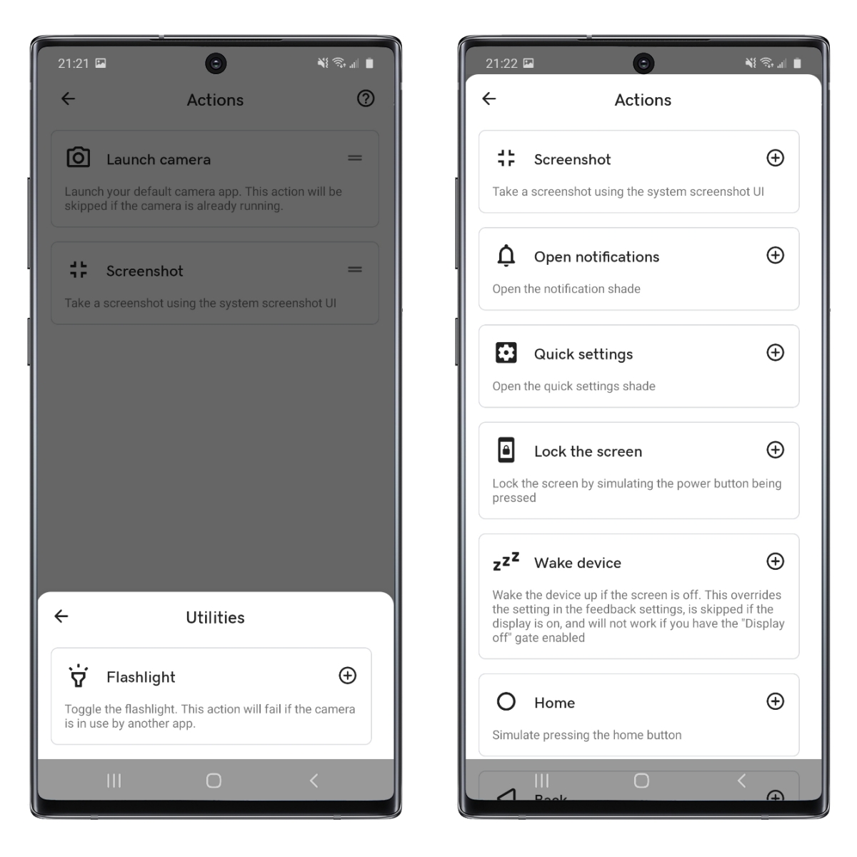 公用工具目前只有手電筒,動作的部份像是截圖、通知開啟、關閉螢幕、喚醒設備等,有一大堆。