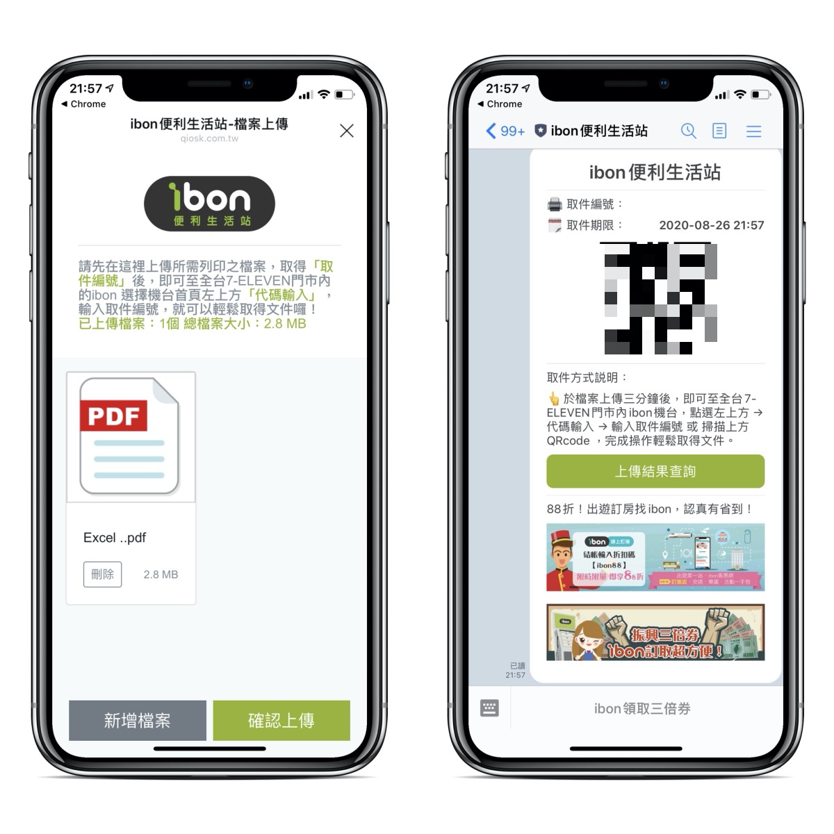 選擇好後進行上傳,就會自動產生 QR Code 在 LINE 的聊天畫面裡,接下來只要帶著這個 QR Code 前往 ibon 機台直接用列印功能,而且還不用自己輸入取件編號,用掃描的方式就可以了,下次要列印時試看看吧。