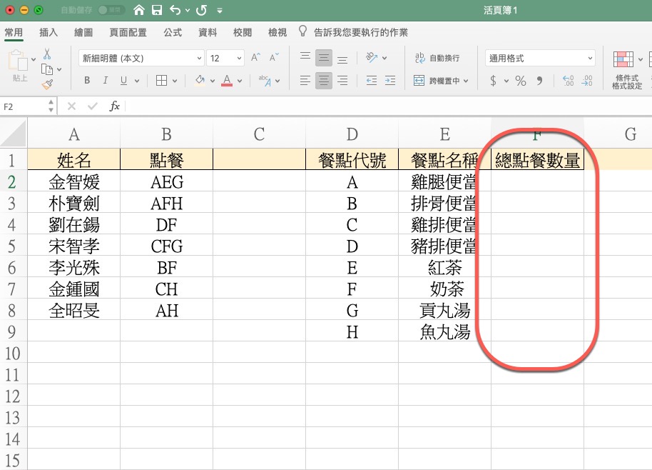 大概就長這樣,餐點你可以每家餐廳一張工作表,這樣以後要點哪一家,就用那家的工作表就好,算是第一次建立資料比較費工一點,但之後就方便多了。