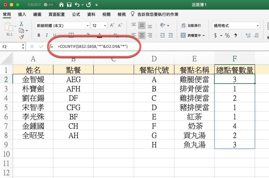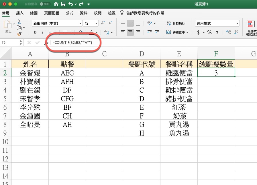 接下來教大家要怎麼計算,因為像是點餐欄是多個英文字的狀況下,我們要怎麼各別統計出 ABC 的數量。