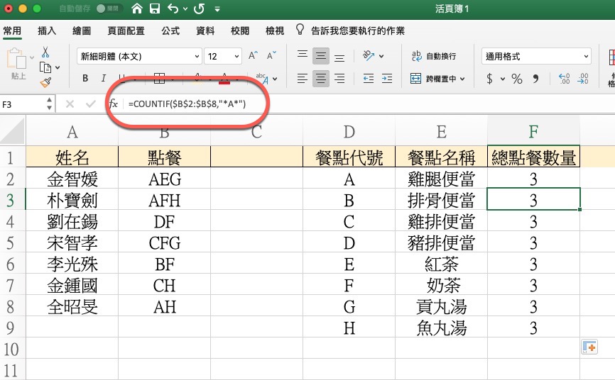先給大家一個簡單的觀念,COUNTIF 大家都會用,是個很簡單的函數,但很多人不知道這比對內容是可以加上萬用字元 * 符號,公式就可以像是以下:
