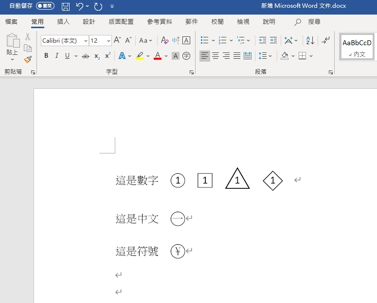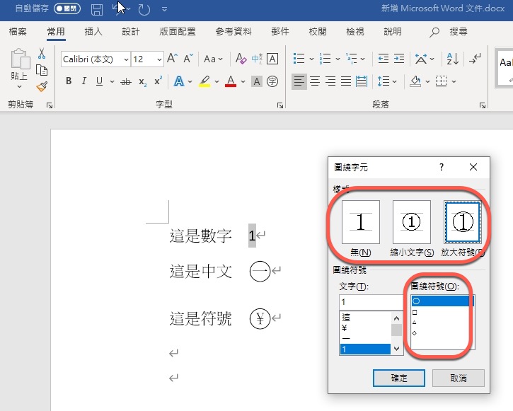 首先給大家看一下功用,今天講的也就是圍繞字元的最基本用法,就是將某文字加上圓框、方框、三角框或是菱形框,是不是覺得這用來美化文字非常實用呢?往下來看吧。