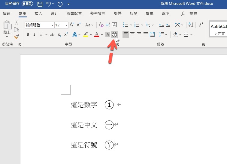 這個一次只能套用在一個字上,選擇要套用的文字、符號或數字等,點擊圍繞字元功能,就可以設定相關樣式,就會套用上去了,去試看看吧。