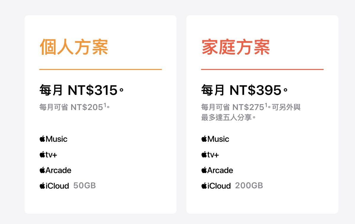 是一個不同服務的組合訂閱包,在台灣只要一次訂閱就能享有 Apple Music、Apple TV+、Apple Arcade 和 iCloud 儲存空間四種 Apple 服務。個人方案為每月 $315 元,訂閱涵蓋四大服務,其中 iCloud 儲存空間為 50 GB,比單獨訂購每月可省下 205 元。