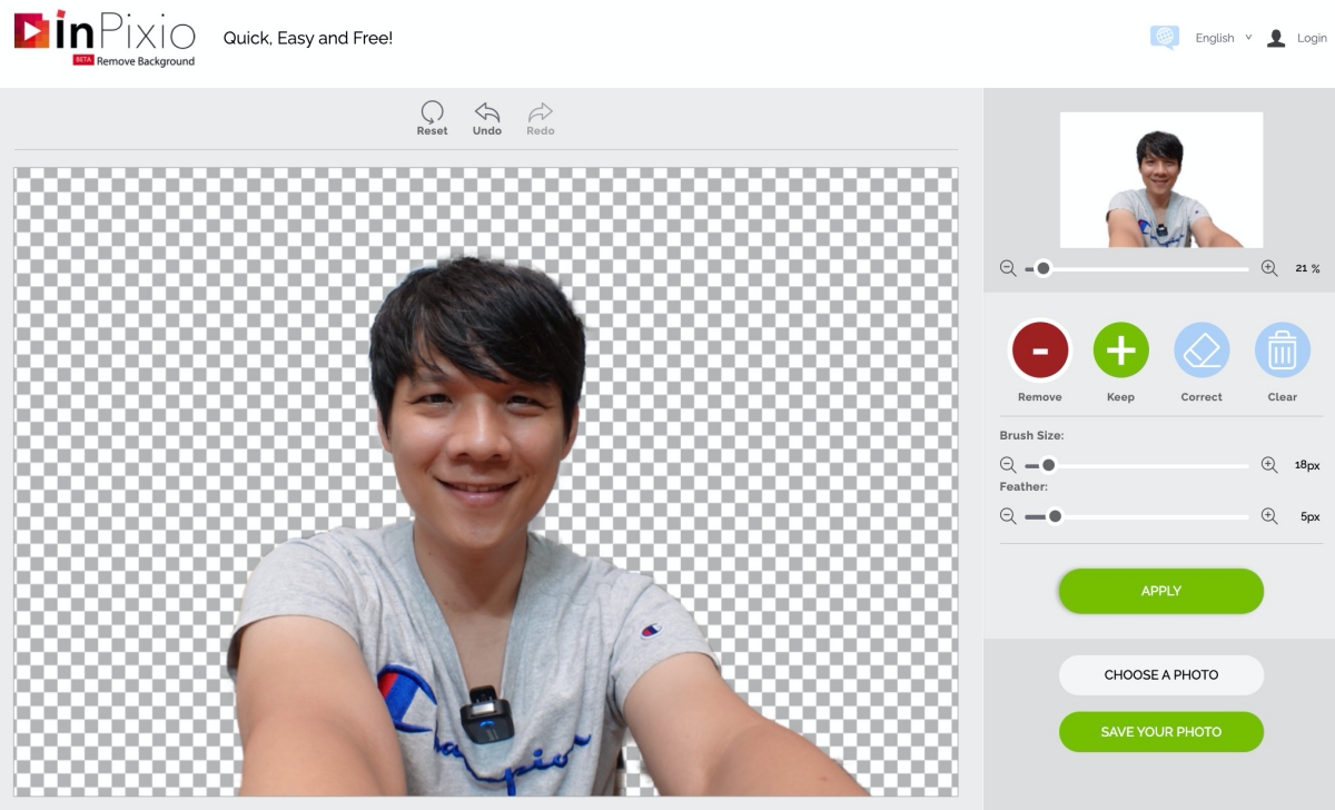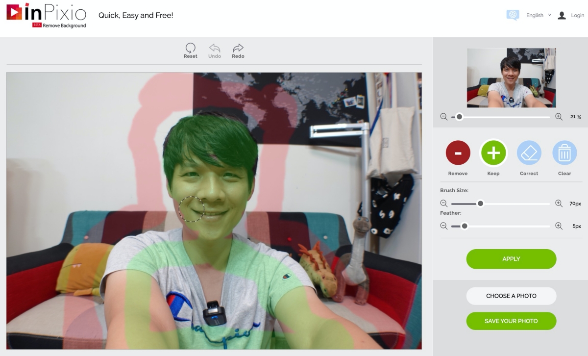 去除的部份只要大約的標記在外圍就好,綠色的部份也是,剩下他會自動判斷來進行去背,按下 apply 就可以看到結果。