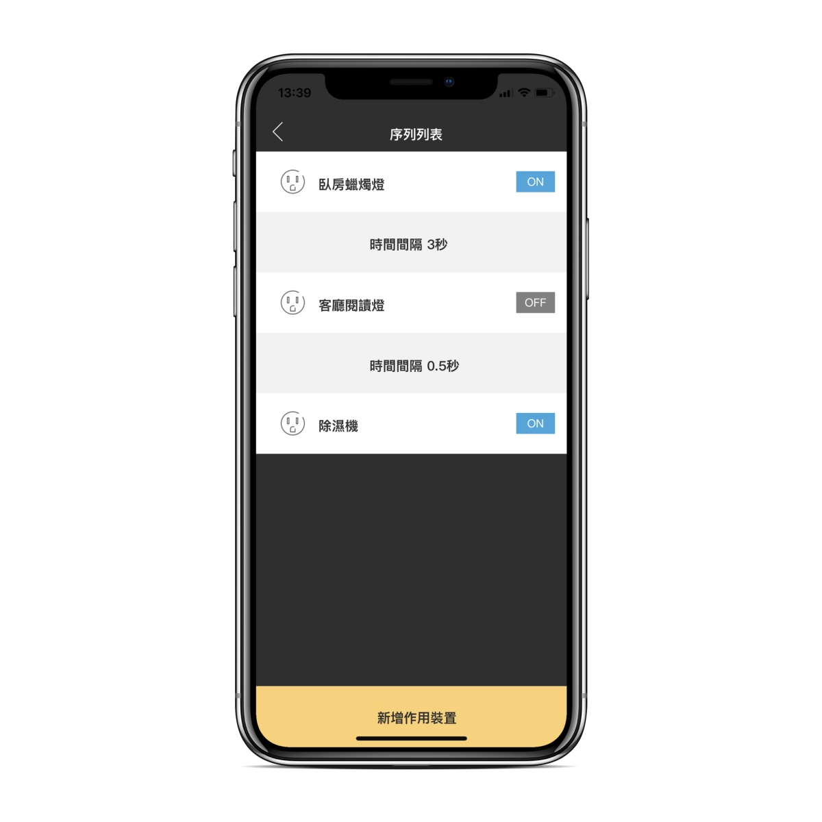 另外在 iHOUSE 裡還有一個很棒的「序列情境」設定功能,就像這樣,可以安排要打開或開啟的項目,且可以設定「間隔時間」,這個超方便的,因為一般只能設定哪些開哪些關,無法依順序做什麼,這個可以用在遙控器的控制上,比如:我要看 Netflix。那麼我就可以依順序做: