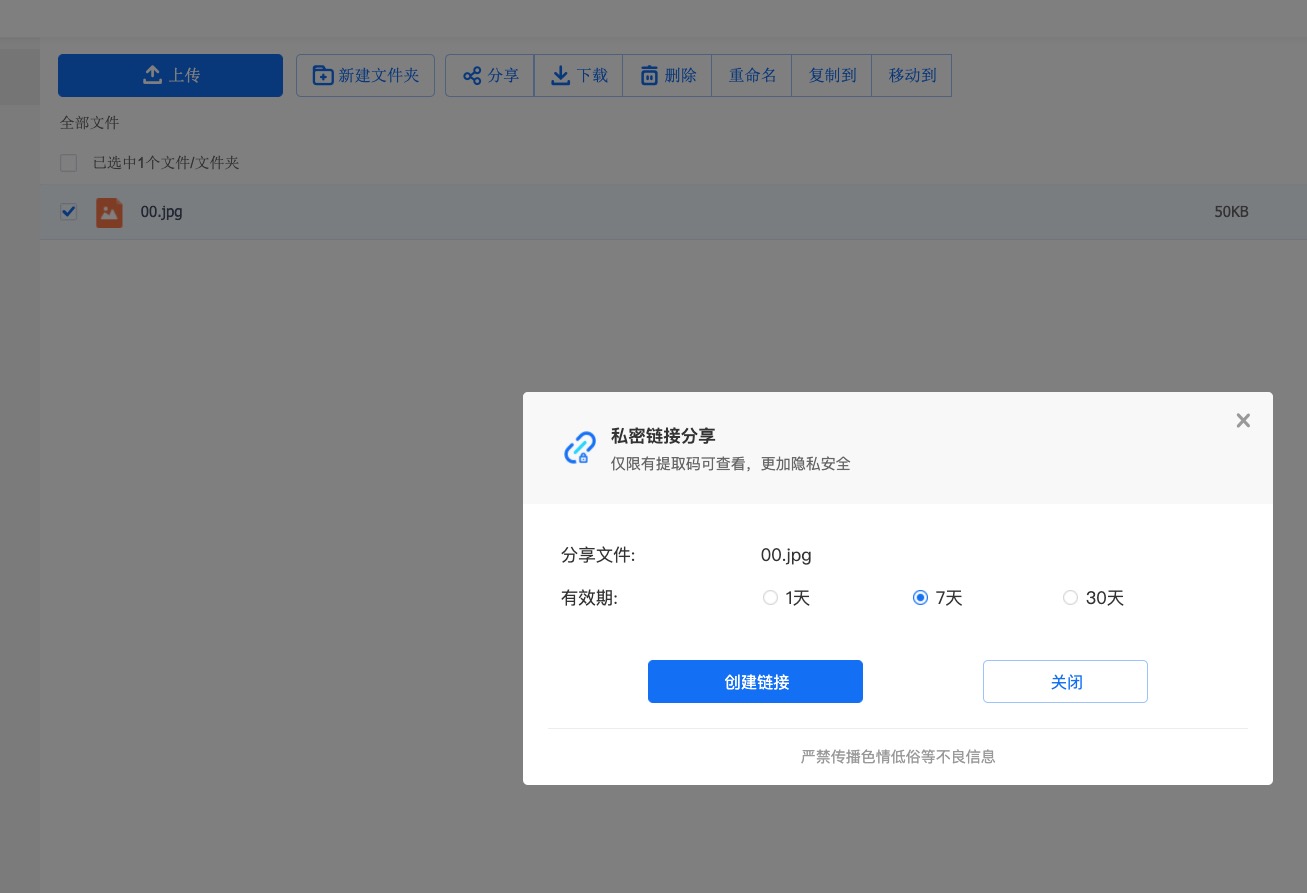 上傳的檔案可以設定分享期限,沒有永久這個選項外,基本上有效期就是 1、7 跟 30 天可以選擇。