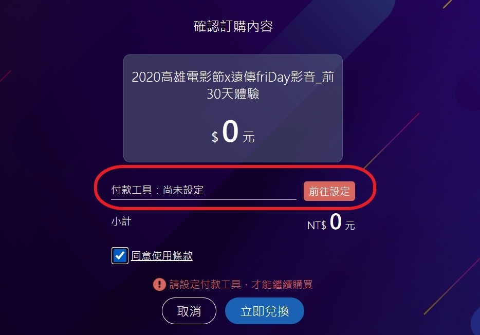 接下來這邊會需要先去設定付款工具,基本上就是要綁定信用卡,綁定後,當你這 30 天用完前可以先按取消訂閱,這樣 30 天到是不會繼續扣款的,所以綁定不用擔心忘記取消這件事,即便結帳是 0 還是得綁定。