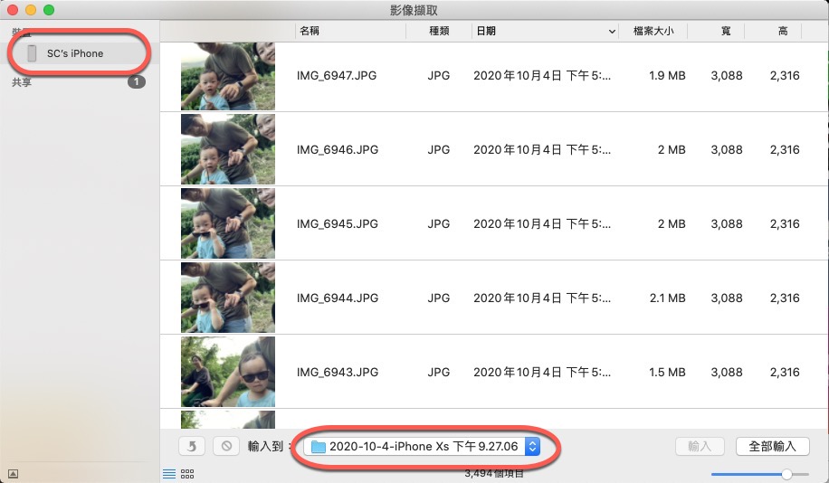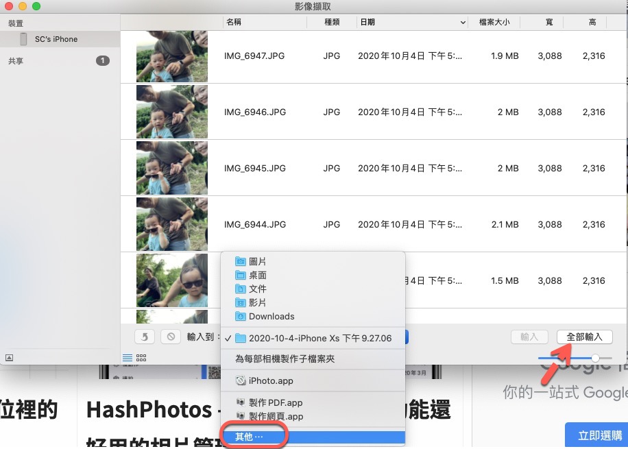 將 iPhone 接上電腦後在左邊就會看到你的裝置,然後下方可以選擇你準備要儲存照片的資料夾。