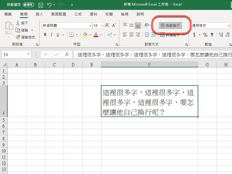 首頁 › 電腦小教室 › Excel 小教室 - 超出欄位的文字要怎麼「自動換行」,別再無限的拉寬欄位了 Excel 小教室 - 超出欄位的文字要怎麼「自動換行」,別再無限的拉寬欄位了 發佈日期:2020/10/6 作者:阿湯 分類:電腦小教室 今天來分享一個超級超級小技巧,因為阿湯實在看太多為了欄位內容而一直「拉寬欄位」來符合內容,如果你的文字很長很長不就變的很奇怪了嗎?有時候排版要適當的使用一些小技巧,比如 Excel 文字超出欄位真的太多的話,我們也可以讓文字換行就好,這裡講的不是 Alt + Enter,而是真的依據欄位寬度自動換行,只要按一下就可以達成,往下來跟大家分享吧。 Excel 教學 - 超出欄位的文字要怎麼「自動換行」 首先就像這樣,很多人直接在 F 欄右線點二下讓內容自動寬度,接下來就會看到 F 欄位寬到一個爆炸,拜託不要這樣排版,真心醜到沒朋友。 以後請直接在「常用」頁籤裡,按下「自動換行」,就搞定了,是不是 5 秒就學到了,以後請善用,下課。