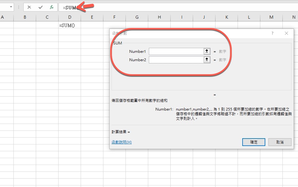 接下來就是很多人不知道且超實用的一個部份了,只要你打完想要用的公式後,以 SUM 為例,在將滑鼠游標停在函數最後面後按下 Ctrl + A,就會叫出函數引數可以填寫,這對很多初學函數的人來說是很便利的一個快捷鍵。