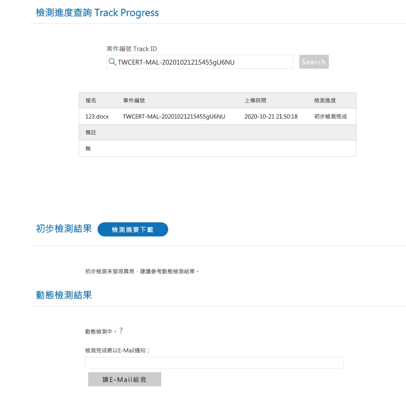 網站:https://viruscheck.tw/index.html使用很簡單,只要將檔案選擇後上傳,然後再選擇要給趨勢科技還是奧義智慧,或二個同時進行檢測分析,如果檔案是有壓縮密碼的記得預先輸入,Email 的部份可填可不填,可以直接線上等結果。