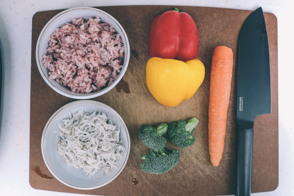 首先我準備的食材包括有蒸熟的飯(紫米、糙米、白米都可以),吻仔魚(或肉末也可以),然後四種顏色的蔬果。